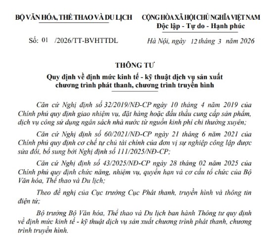 Ngày 16/3/2026 Bộ Văn hóa, Thể thao và Du lịch ban hành Thông tư số 03/2026/TT-BVHTTDL Quy định về định mức kinh tế - kỹ thuật dịch vụ bảo tồn, phục dựng, tái hiện và phát huy các giá trị văn hóa truyền thống đặc sắc; sưu tầm, bảo quản, trưng bày...