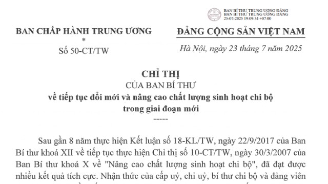Ngày 23/7/2025, đồng chí Trần Cẩm Tú - Ủy viên Bộ Chính trị, Thường trực Ban Bí thư đã ký ban hành Chỉ thị số 50-CT/TW về tiếp tục đổi mới và nâng cao chất lượng sinh hoạt chi bộ trong giai đoạn mới.