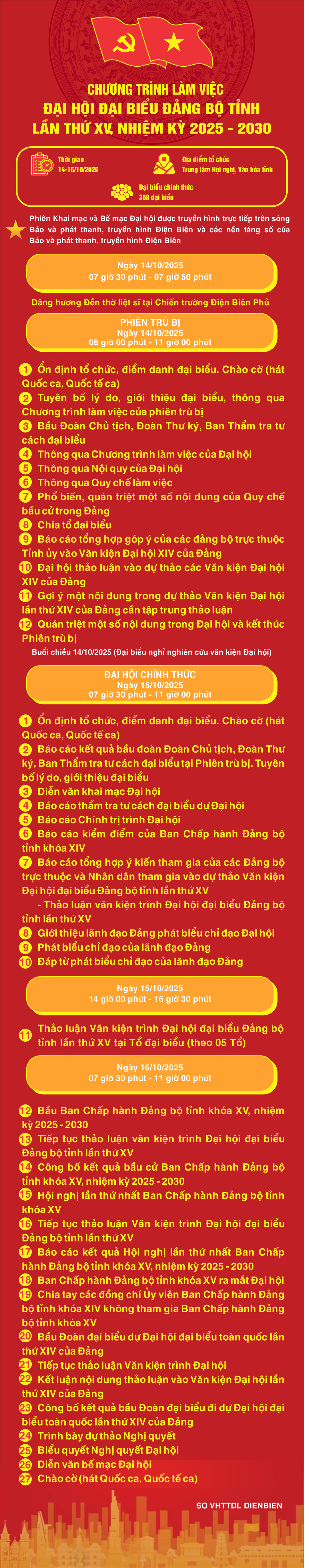 Infographic: Chương trình làm việc Đại hội đại biểu Đảng bộ tỉnh Điện Biên lần thứ XV, nhiệm kỳ 2025 - 2030