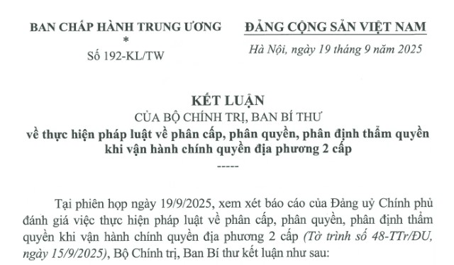 Ngày 19/9/2025, Bộ Chính trị và Ban Bí thư đã ban hành Kết luận số 192-KL/TW về việc thực hiện pháp luật về phân cấp, phân quyền, phân định thẩm quyền khi vận hành chính quyền địa phương 2 cấp. Đây là văn bản có ý nghĩa chiến lược, đánh dấu bước phát triển mới trong công cuộc hoàn thiện thể chế, nâng cao hiệu lực, hiệu quả của hệ thống chính trị tại địa phương.