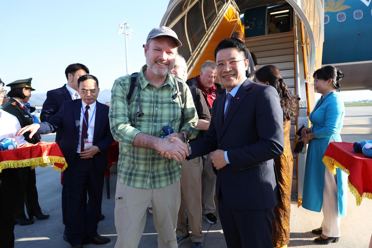 Đại diện tỉnh Điện Biên chào đón phi hành đoàn cùng các vị khách đầu tiên đến Điện Biên